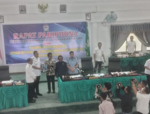 Bupati Toba Effendi SP Napitupulu dan Wakil Bupati Audi Murphy Sitorus menyerahkan LKPJ Pada Rapat Paripurna di Kantor DPRD Toba, Balige