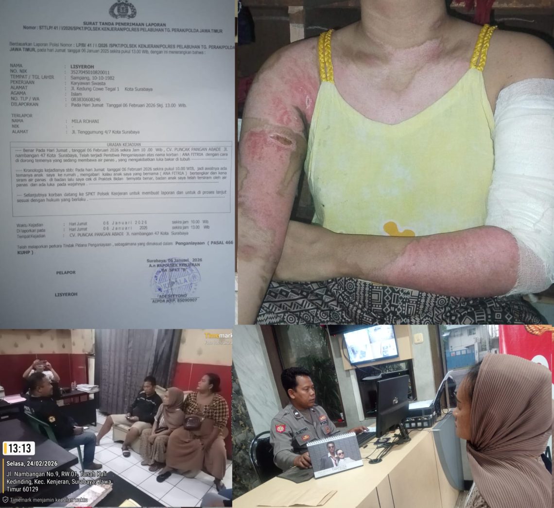 Berdasarkan laporan kepolisian (LP) nomor : LP/B/41/I/2026/SPKT/Polsek Kenjeran/Polres Pelabuhan Tanjung Perak-Polda Jawa Timur, Pada Hari Jumat 06 Januari 2026, sekitar pukul 13.00 Wib (siang hari), Lisyeroh selaku orang tua korban (Ana Fitria) warga jln Gedung Cowek Tegal 1, melaporkan atas peristiwa penganiayaan terhadap anaknya ke Polsek Kenjeran (red), Wilayah Hukum Polres Tanjung Perak (KP3), awak media mencoba mengkonfirmasi keluarga Korban yakni Lisyeroh selaku orang tuah korban mengatakan, Penganiayaan tersebut terjadi di jln Nambangan No : 47, tepatnya CV. Puncak Pangan Abadi dimana dia (Ana Fitria) bekerja,” ucapnya.