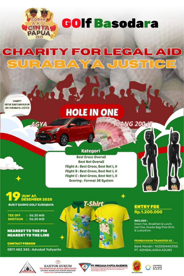 Gobar Aku Cinta Papua tahun ini tampil dengan misi yang lebih kuat dan relevan. Turnamen ini bukan sekadar pertemuan komunitas golfer, melainkan charity for legal aid, sebuah gerakan kemanusiaan untuk mendukung LBH Surabaya Justice. Di tengah citra golf yang identik dengan kalangan elite dan eksklusivitas, Gobar hadir membalik stigma: fairway tak hanya menjadi arena kompetisi, tetapi juga jalan menuju keadilan sosial.