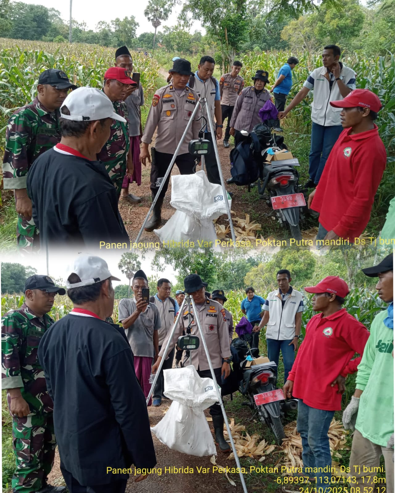 WARTAPENASATUJATIM | Bangkalan — Dalam rangka mendukung program Ketahanan Pangan Nasional, Babinsa Koramil 0829-17/Tanjungbumi Serma Muari melaksanakan kegiatan pendampingan pengobinan dan penimbangan hasil panen jagung milik Kelompok Tani (Poktan) Putra Mandiri di Desa Tanjungbumi, Jumat (24/10/25).