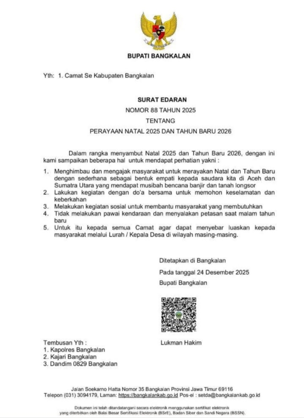 Bupati Bangkalan Keluarkan Surat Edaran Tentang Perayaan Natal 2025 dan Tahun Baru 2026