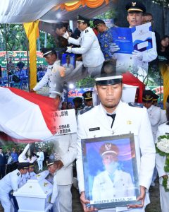 Bupati Samosir, Vandiko T. Gultom, memimpin langsung upacara kenegaraan pemakaman Camat Palipi, Roberd Sinaga, yang digelar di Huta Simanampang, Desa Sinaga Uruk, Kecamatan Nainggolan, Sabtu ( 7/3/2026 ).