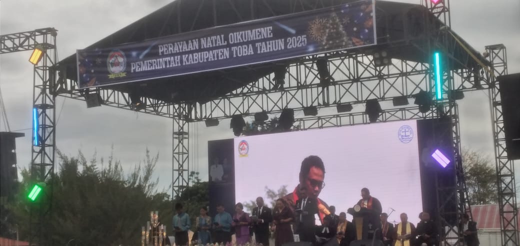 Toba, wartapenasatu.com – Bupati Toba di dampingi Nyonya Astita Efendi Sintong Napitupulu serta para pimpinan perangkat daerah menghadiri Perayaan Natal Oikumene di Lapangan Komplek Kantor Bupati Toba-Balige dengan mengangkat tema “Allah hadir untuk menyelamatkan keluarga” (Matius 1:21–24) yang berlangsung di lapangan Komplek Kantor Bupati Toba-Balige (Sabtu 27 Desember 2025).