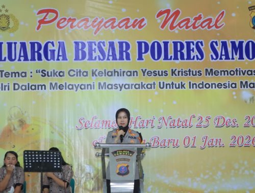 Samosir, Sumatera – Keluarga Besar Polres Samosir menggelar Perayaan Hari Raya Natal Tahun 2025 dengan penuh khidmat dan sukacita, bertempat di Aula Paroki Gereja Katolik Santo Mikhael, Desa Pardomuan I, Kecamatan Pangururan, Kabupaten Samosir, pada Sabtu (27/12/2025)Perayaan Natal tahun ini mengangkat tema “Suka Cita Kelahiran Yesus Kristus Memotivasi Polri dalam Melayani Masyarakat untuk Indonesia Maju”, dengan ayat renungan Alkitab Matius 1:21–24, sebagaimana tertuang dalam Surat Telegram Kapolri Nomor: ST/2543/XI/BIN.1/2025 tanggal 24 November 2025.