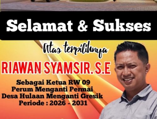 WARTAPENASATUJATIM | GRESIK – Kepemimpinan di tingkat akar rumput kembali mendapat sorotan. Riawan Syamsir, S.E. resmi terpilih sebagai Ketua RW 09 Perum Menganti Permai, Desa Hulaan, Kecamatan Menganti, Kabupaten Gresik, untuk masa bakti 2026–2031.