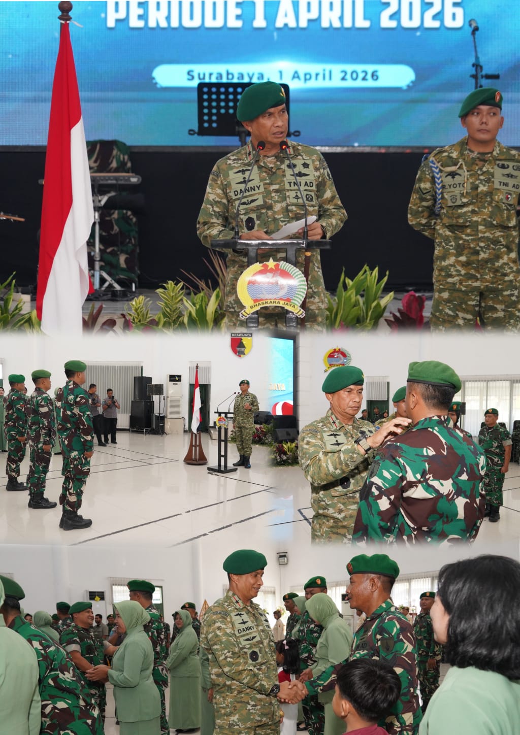 WARTAPENASATUJATIM | SURABAYA – Komandan Korem (Danrem) 084/Bhaskara Jaya, Brigjen TNI Danny Alkadrie, memimpin upacara pelantikan kenaikan pangkat Bintara dan Tamtama periode 1 April 2026 yang dirangkaikan dengan acara halal bihalal Hari Raya Idul Fitri 1447 H. Kegiatan berlangsung di Aula Makorem, Jalan Ahmad Yani No. 1 Siwalankerto, Kecamatan Wonocolo pada Rabu (1/4/2026).