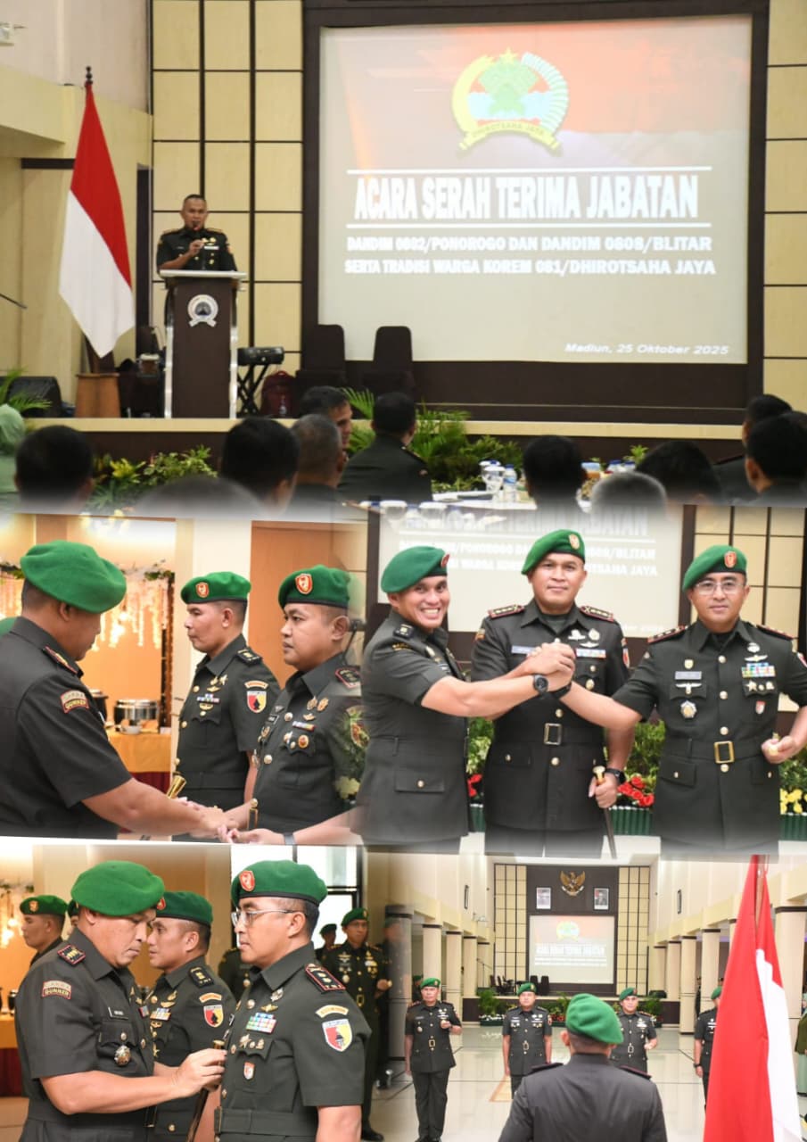 WARTAPENASATUJATIM | Madiun – Dua jabatan strategis di jajaran Korem 081/DSJ diserahterimakan. Dandim 0802/Ponorogo dari Letkol Inf Dwi Soerjono kepada Letkol Inf Farauk Saputra dan Dandim 0808/Blitar dari Letkol Inf Hendra Sukmana kepada Letkol Inf Virlani Arudyawan.