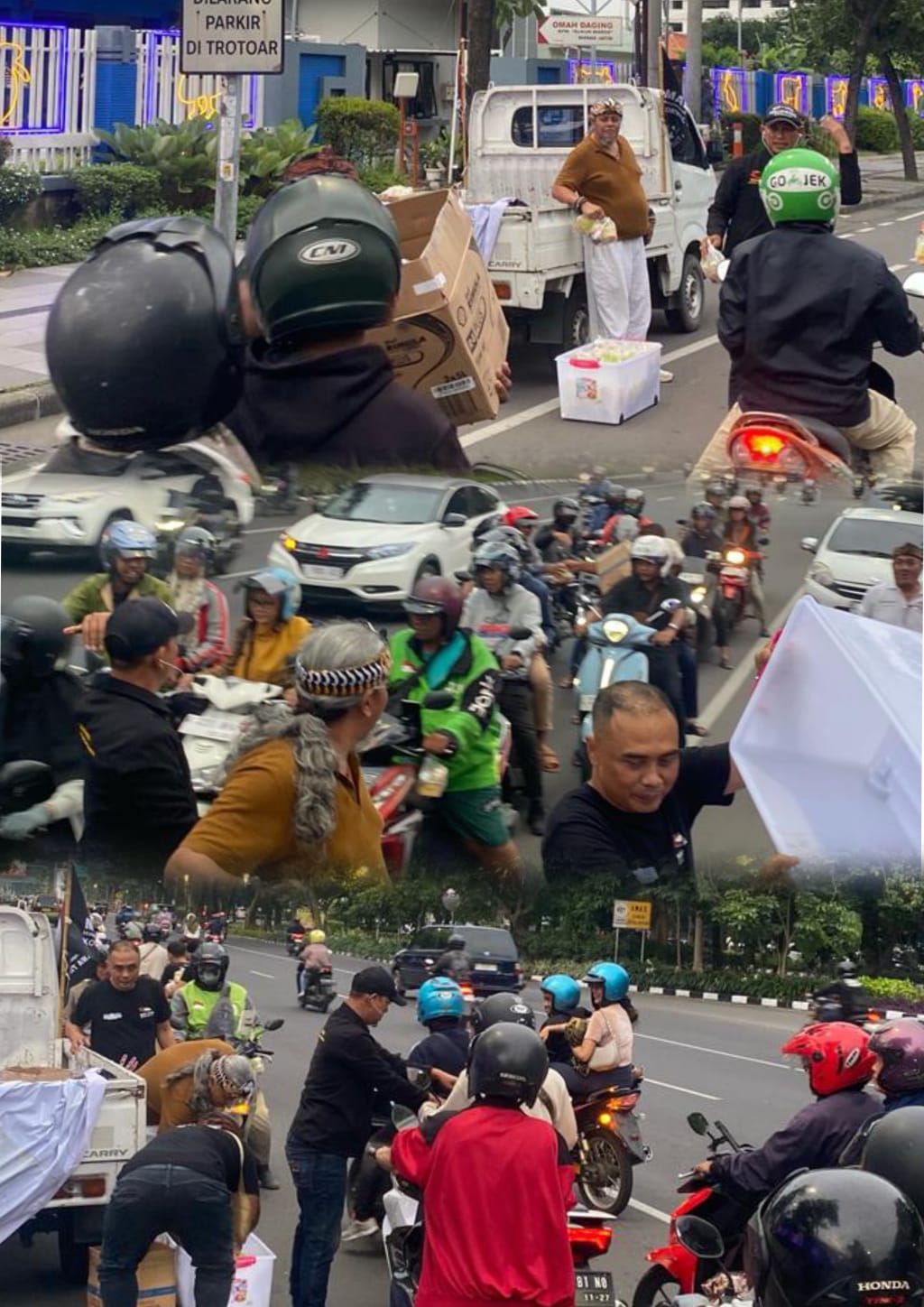 Sebanyak 250 paket sayur manisah bersantan tahu, tempe, dan cecek; 250 paket kurma; 250 botol es sirup melon dengan isian blewah; serta 250 paket gorengan berisi donat, ote-ote, tahu isi, dan dadar jagung dibagikan dengan tertib dan penuh kelembutan.
