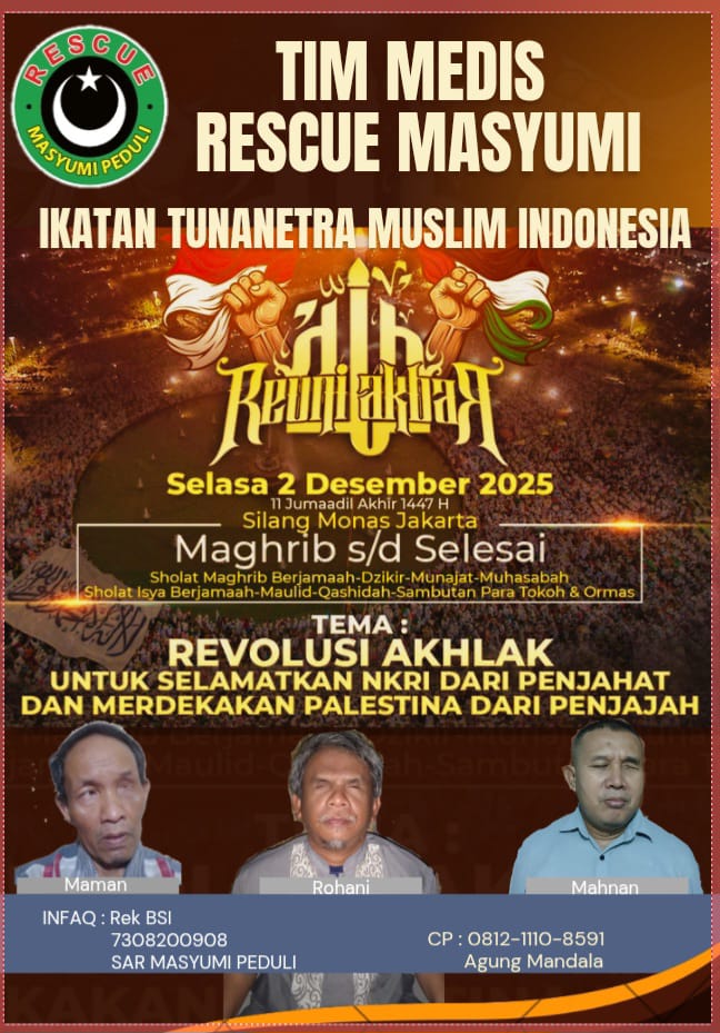 Dengan penuh rasa syukur dan semangat ukhuwah, kami dari Rescue Masyumi Peduli mengajak seluruh kaum muslimin dan muslimat untuk berpartisipasi dalam penggalangan donasi guna mendukung keberangkatan dan kebutuhan para anggota Ikatan Tunanetra Muslim Indonesia (ITMI) dalam menghadiri Reuni Akbar 212 di Monas yang akan membantu di tenda medis Rescue Masyumi untuk tenaga kesehatan terapis
