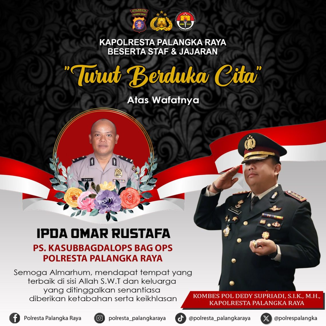 “Atas nama keluarga besar Polresta Palangka Raya, kami menyampaikan turut berduka cita sedalam-dalamnya. Semoga almarhum mendapat tempat terbaik di sisi Allah SWT, dan keluarga yang ditinggalkan diberikan ketabahan serta kekuatan,” ucap Kapolresta.