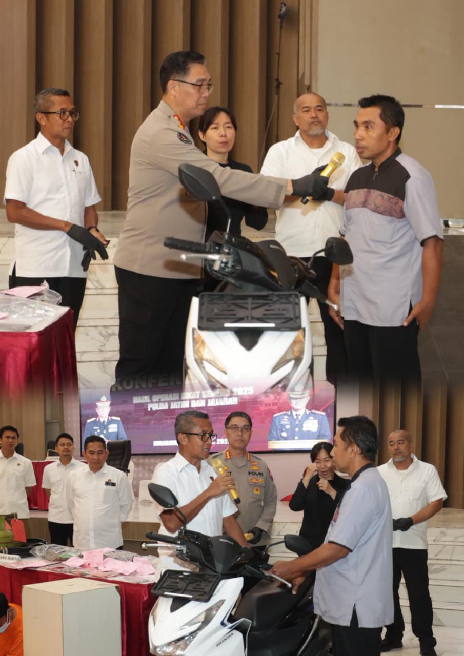 WARTAPENASATUJATIM | SURABAYA – Direktorat Reserse Kriminal Umum (Ditreskrimum) Polda Jawa Timur menyerahkan kembali satu unit sepeda motor Honda Beat hasil pengungkapan kasus pencurian kendaraan bermotor dalam Operasi Sikat Semeru 2025.