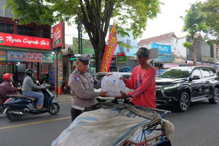 Paket berisi kebutuhan pokok itu langsung dibagikan personel Satlantas ke titik-titik keramaian.