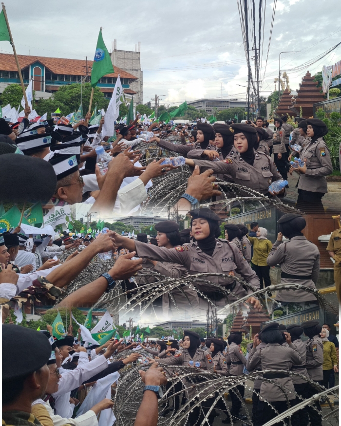 Sebagai bentuk pendekatan empati kepada massa aksi, tim negosiator dari barisan Polwan juga membagikan air minum kepada peserta aksi.