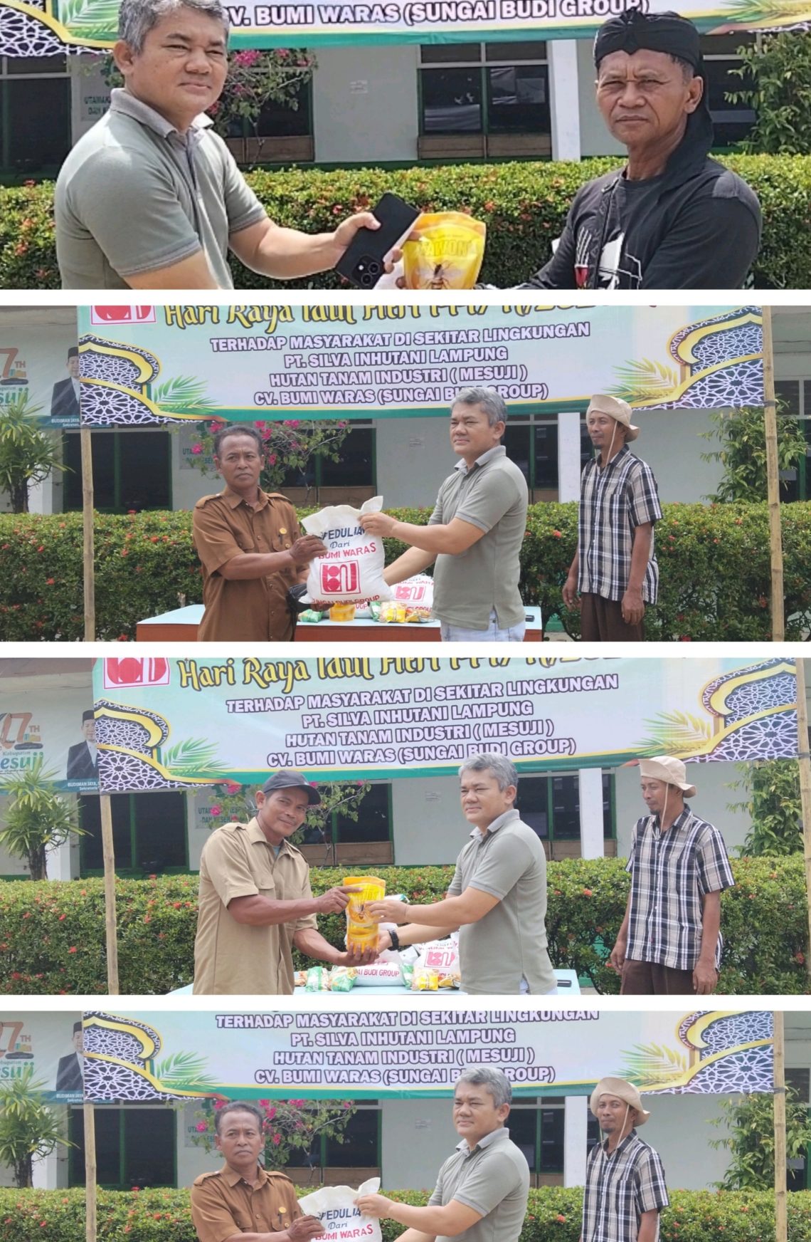 Bantuan tersebut diserahkan langsung oleh Pimpinan PT Silva inhutani bersama Uspika dan Kepolisian, KPH, serta Perwakilan Kabupaten Mesuji dan Kabupaten Tulang bawang Tulang Bawang Barat setempat. Hal itu terpantau oleh awak media saat pembagian bantuan tersebut pada Senin 15/3/2026.