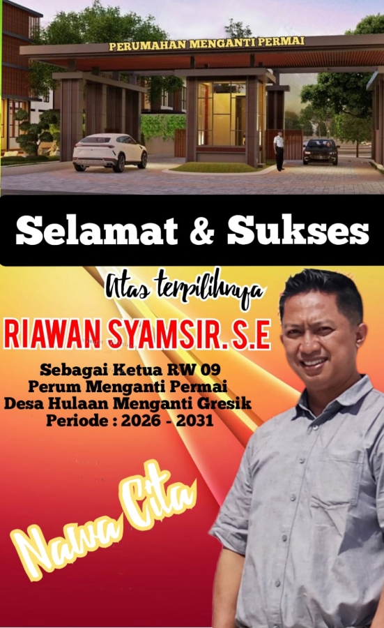 WARTAPENASATUJATIM | GRESIK – Kepemimpinan di tingkat akar rumput kembali mendapat sorotan. Riawan Syamsir, S.E. resmi terpilih sebagai Ketua RW 09 Perum Menganti Permai, Desa Hulaan, Kecamatan Menganti, Kabupaten Gresik, untuk masa bakti 2026–2031.