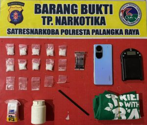 Kasatresnarkoba Polresta Palangka Raya AKP Agung Wijaya Kusuma menjelaskan, dari hasil olah TKP, ditemukan sejumlah barang bukti lainnya berupa timbangan digital, sendok sabu, plastik klip, botol permen, tas warna hijau, serta satu unit handphone Oppo Reno 10 yang digunakan pelaku untuk transaksi.