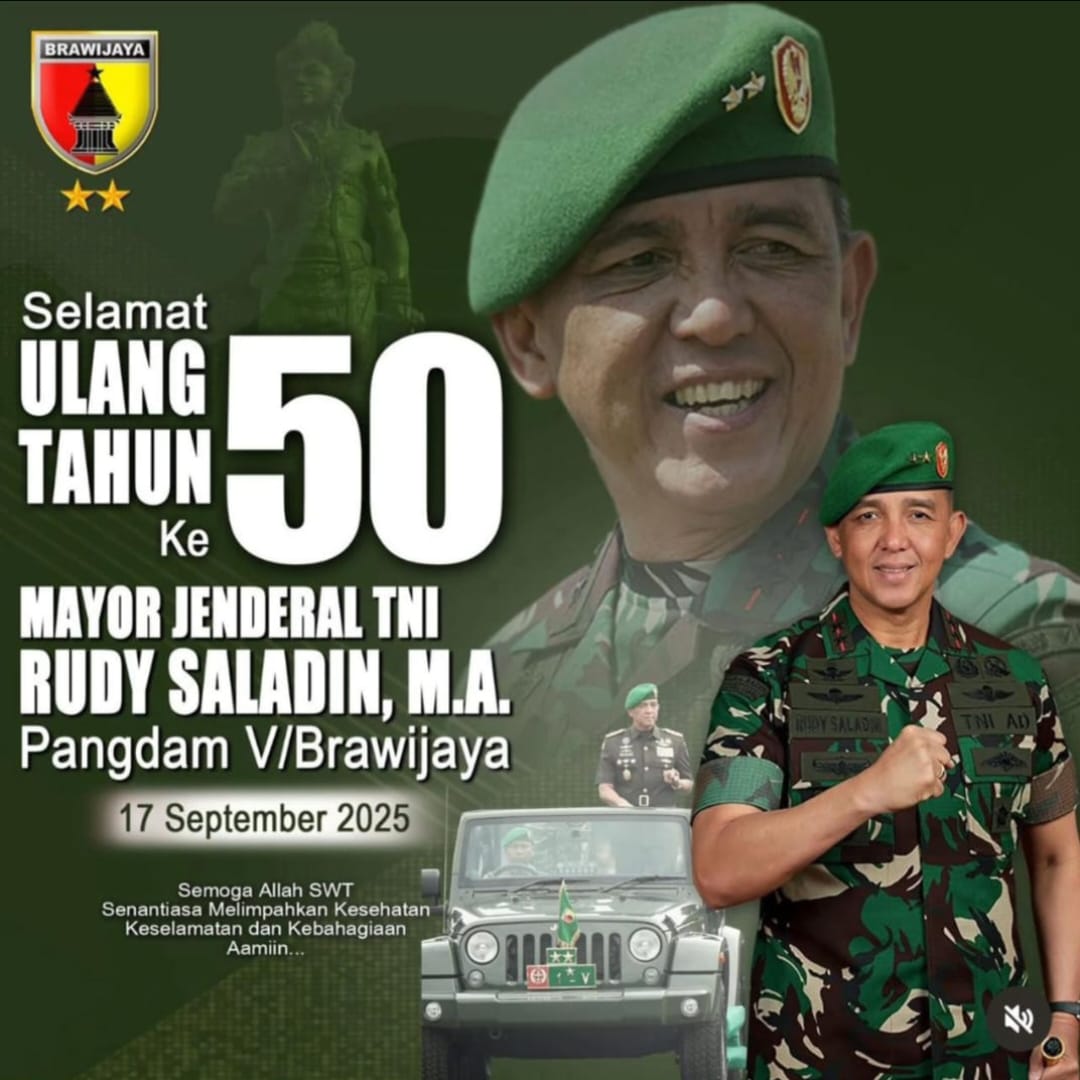 WARTAPENASATUJATIM | Surabaya – Di hari yang istimewa ini, kami segenap Pimpinan, Pemred dan Wartawan dari Media Warta Pena Satu Jatim, dengan segenap hati mengucapkan Selamat Ulang Tahun ke-50 kepada Bapak Mayor Jenderal TNI Rudy Saladin, M.A., Pangdam V/Brawijaya, pada tanggal 17 September 2025.
