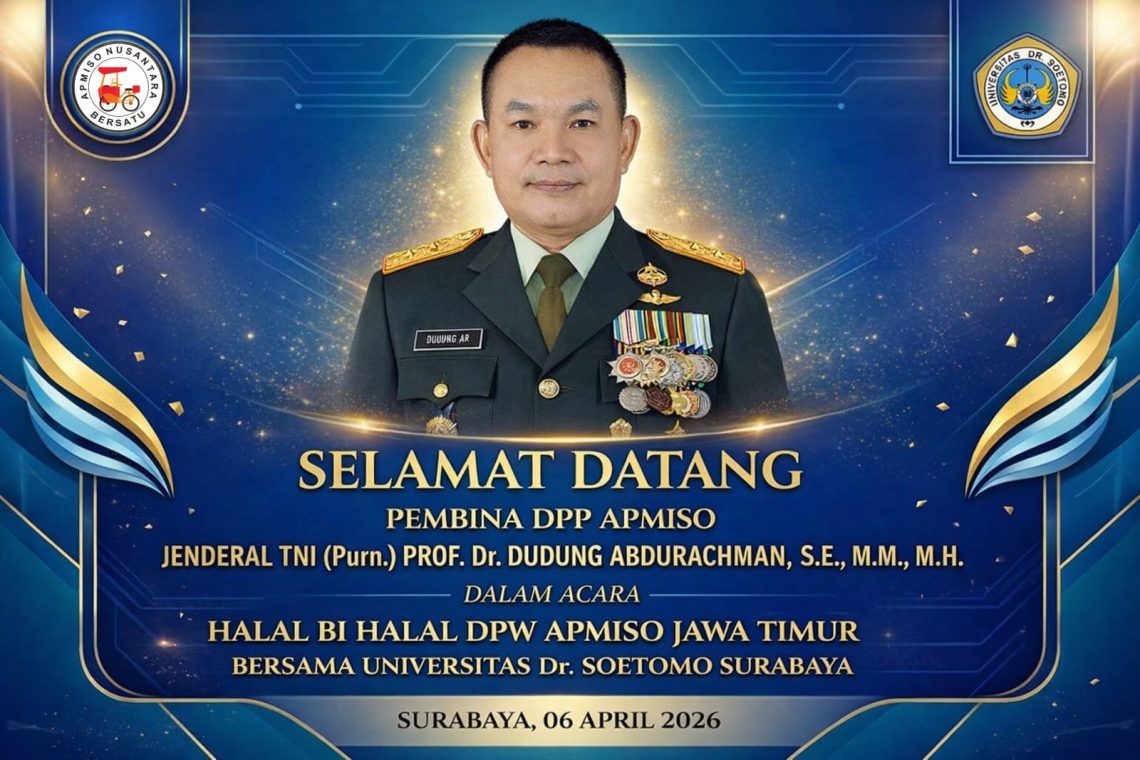 Surabaya – Dewan Pimpinan Wilayah (DPW) Asosiasi Pedagang Mie dan Bakso (APMISO) Jawa Timur menggelar acara Halal Bi Halal di Aula Universitas Dr. Soetomo Surabaya 06 April 2026, sekaligus mengukuhkan kemitraan strategis melalui penandatanganan Nota Kesepahaman (MOU) Tri Dharma Perguruan Tinggi dan Program Studi Lanjut Pendidikan Tinggi dengan Universitas Dr. Soetomo (Unitomo) Surabaya. Acara ini semakin istimewa dengan kehadiran Ketua Umum APMISO, Drs. Lasiman, S.Pd, dan Pembina APMISO, Jenderal TNI (Purn). Prof. Dr. Dudung Abdurrachman, S.E., M.M., M.H. serta dukungan penuh dari jajaran Forkopimda Jawa Timur.