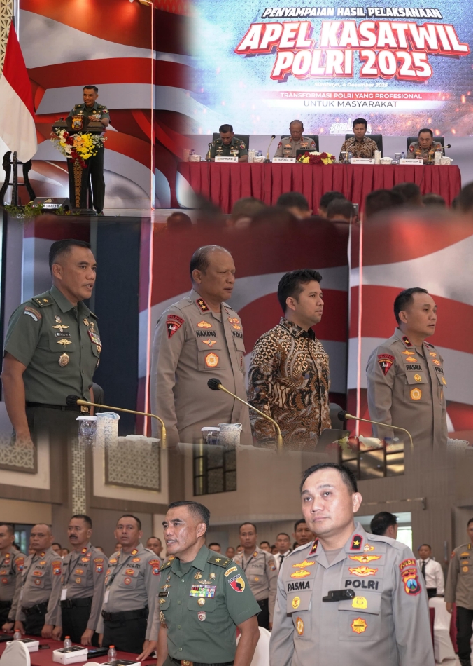 WARTAPENASATUJATIM | SURABAYA – Pangdam V/Brawijaya Mayjen TNI Rudy Saladin, M.A., melalui Kapoksahli Pangdam V/Brawijaya Brigjen TNI Singgih Pambudi Arianto, S.I.P., M.M., menghadiri Apel Kasatwil dan Anev Sitkamtibmas 2025 Polda Jatim di Gedung Mahameru Polda Jatim, Kamis (04/12/2025). Kegiatan ini menjadi forum strategis memperkuat sinergitas TNI-Polri dalam menjaga stabilitas keamanan wilayah Jawa Timur.