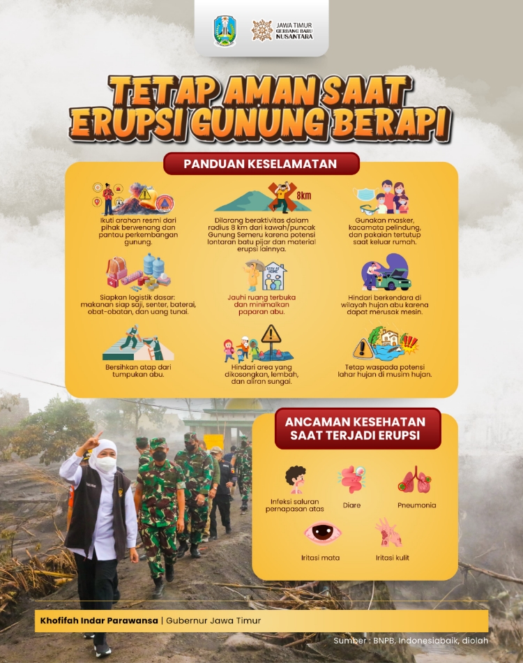 Gubernur Khofifah mengimbau masyarakat, khususnya warga di Kabupaten Lumajang dan Kabupaten Malang yang tinggal di kawasan rawan bencana Semeru, agar meningkatkan kewaspadaan serta mematuhi seluruh rekomendasi PVMBG dan arahan aparat di lapangan.