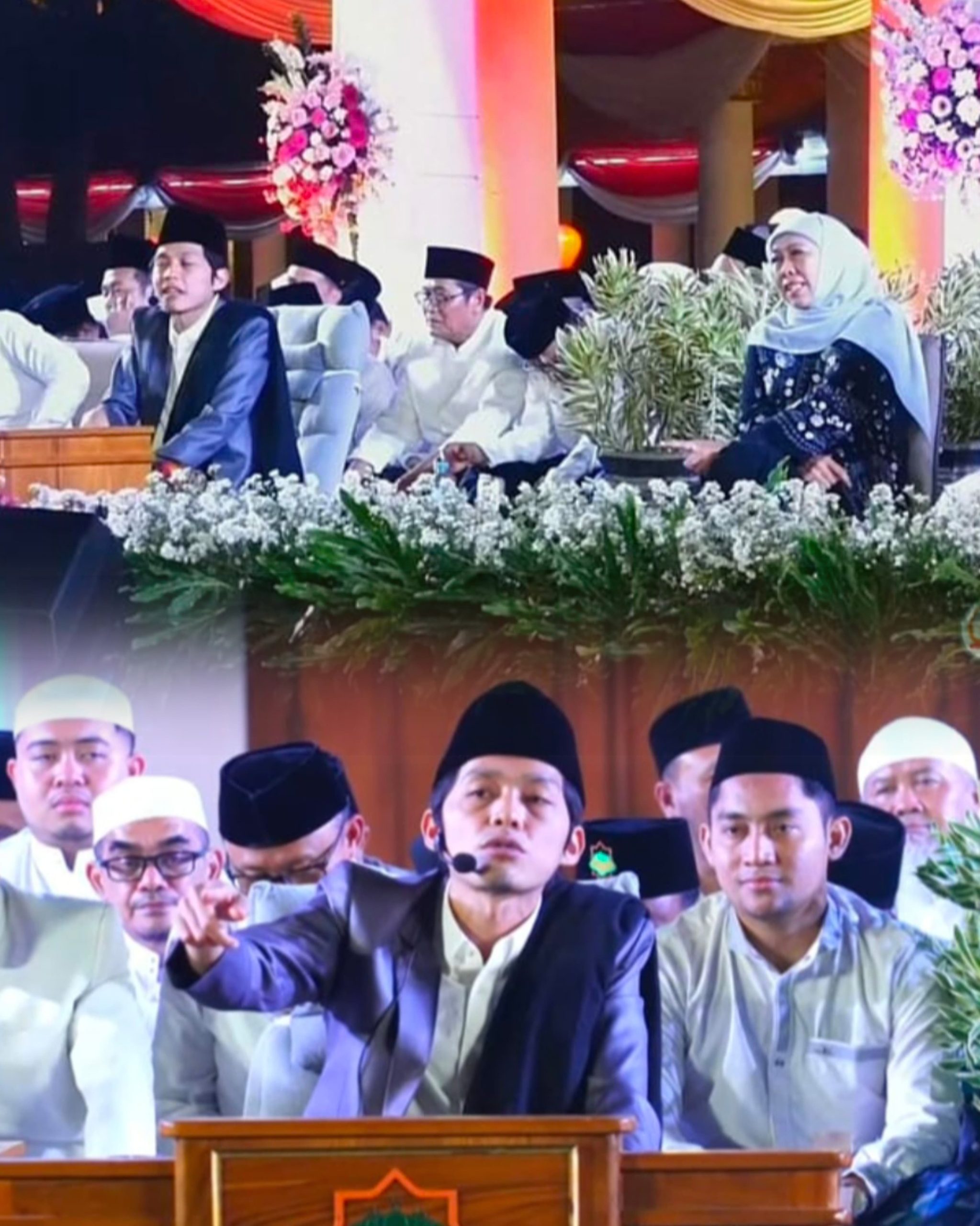 “Alhamdulillah, malam ini kita mensyukuri Hari Santri dengan keadaan sehat walafiat. Insya Allah, Jawa Timur ini ‘dekengan pusat’, langsung Allah SWT,” ujar Gus Iqdam disambut shalawat dari ribuan jamaah.